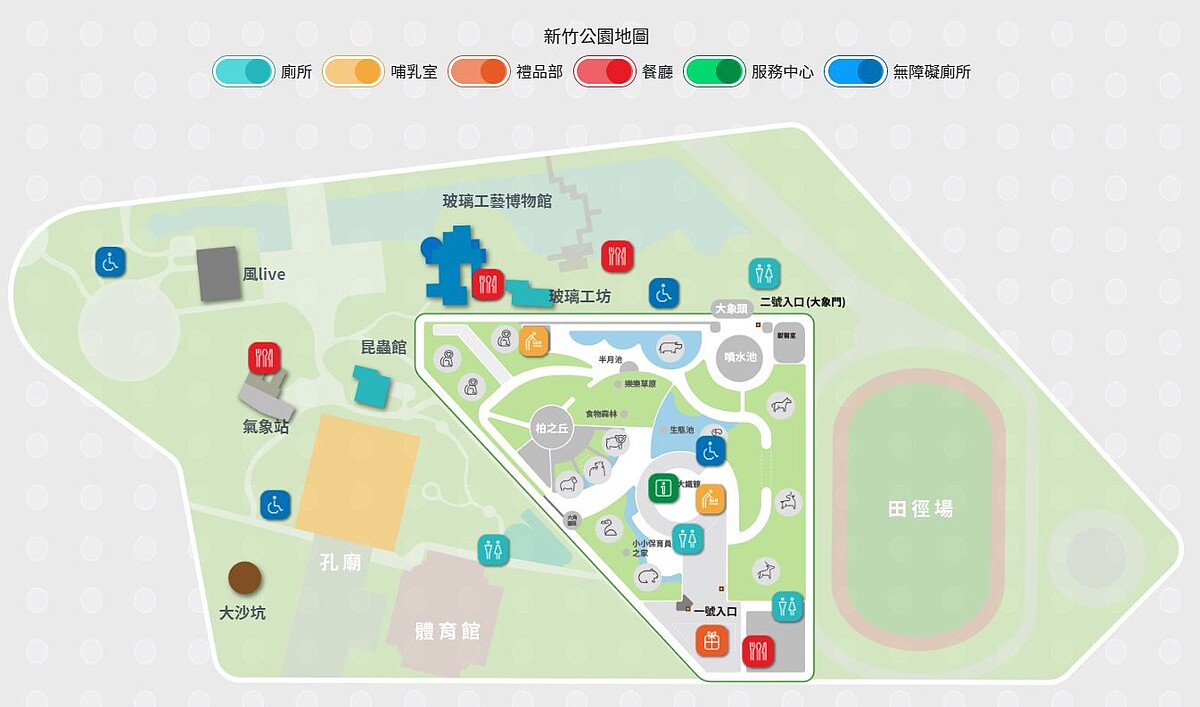 有著84年歷史的新竹動物園,重新開幕後以「公園裡的動物園」及「對動物友善的動物園」出發,打破傳統「動物在籠內被看」的模式,讓伊蘭羚羊與歐洲小鹿共生於開闊草原,還提供隱密的躲藏空間。也將日治時期興建的「氣象站」變身為親子生活書店,以及將荒廢數十年的中廣播音站,修建成「昆蟲館」。全長近100公尺的大沙坑,則提供3種不同類型沙池,肯定讓小朋友玩得盡興。