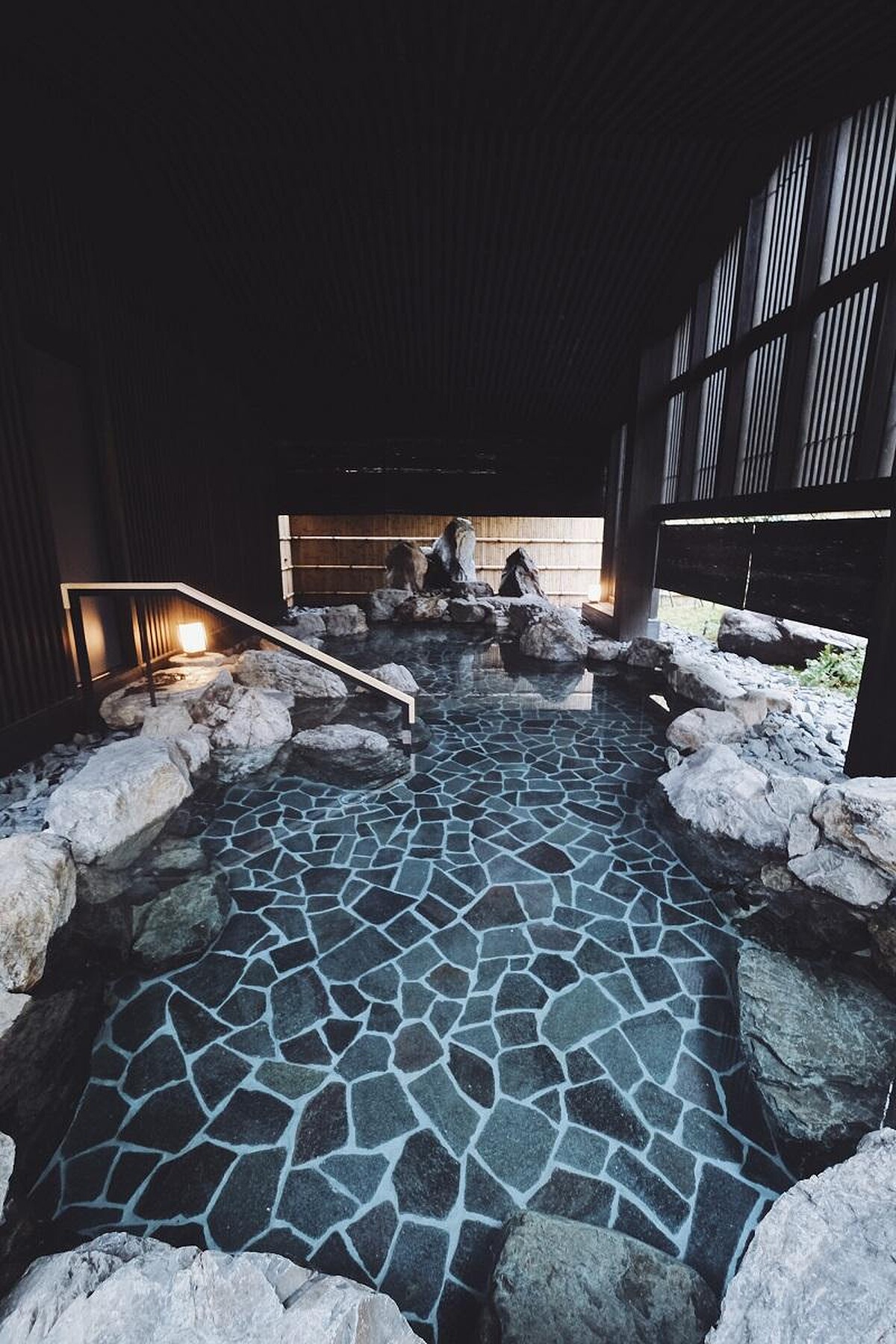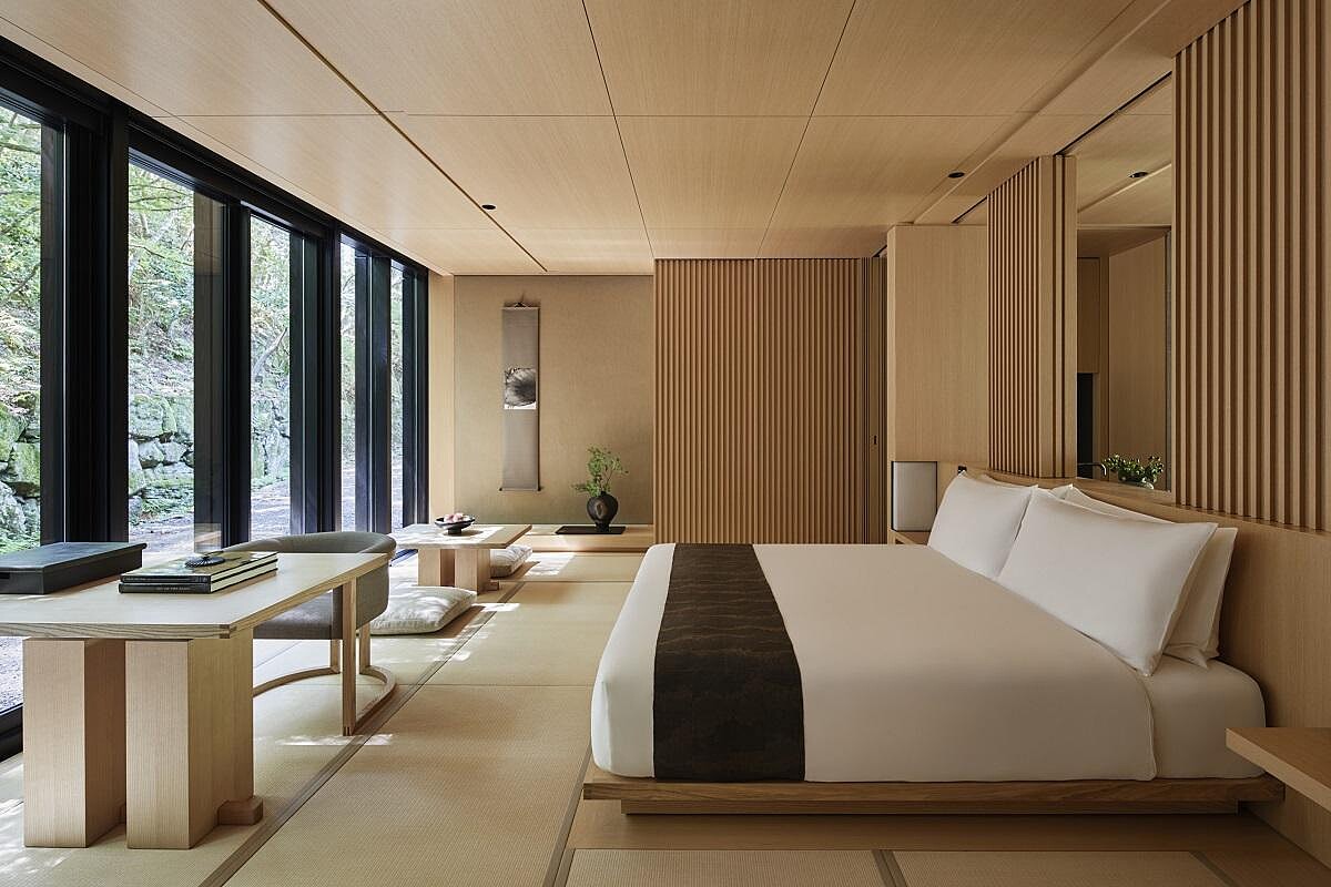 地板上鋪就的榻榻米和擺飾的當地藝術家作品、手工花瓶、甚至是請職人特別製作的樂燒(Raku)都令人感受到日本禪意,在完美中帶有寂寥的美感,予人古樸沉靜的感受。極為寬敞的浴室為房間內的一大亮點,每間房間皆備有日式木製大浴缸,以日本中部出產的扁柏木打造。