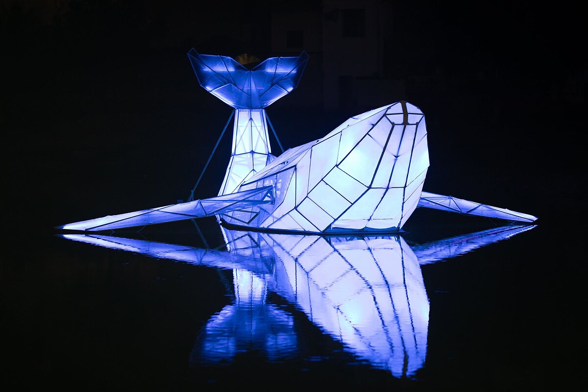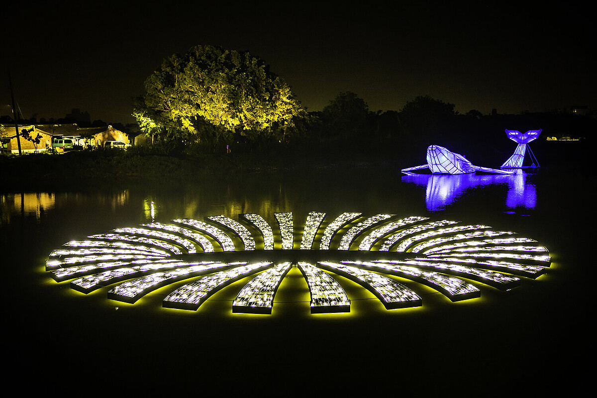 另外還有王連晟擺設草地上的《海潮光音》,隨著海浪此起彼落聲音,燈光亮度會隨之提升,也會逐漸擴大照射範圍。長年參與燈節的在地藝術家「禹禹藝術工作室」的作品《光際, 之間》,用水上具飄浮感的視覺裝置,呈現出生命裡多數的逝去、卻不曾消失的意象。