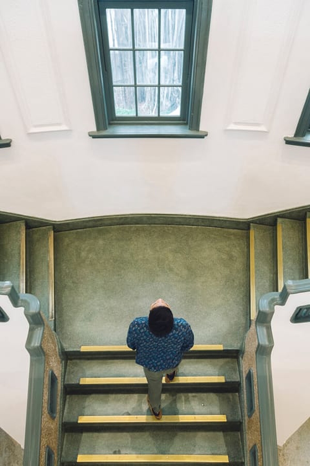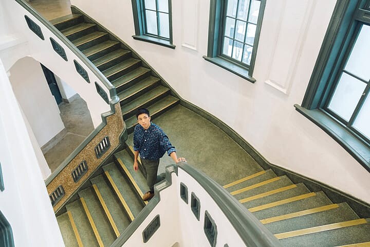 XXDanieL美拍秘訣:攝影師站在二樓平台往樓梯的方向拍,透過俯角帶出樓梯的視覺延伸感,也能夠拍出完全對稱、符合幾何美學的吸睛照片。