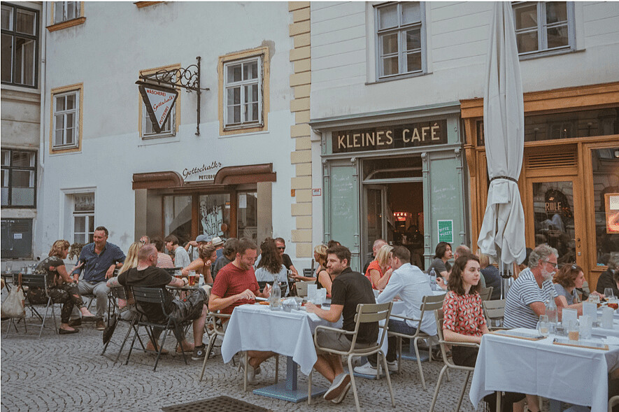 這裡也是意外的沒有什麼觀光客,從傍晚開始,就可以看到非常多當地人坐在戶外喝酒聊天,到了晚上更是熱鬧,Kleines Cafe旁邊就是觀光客必去的「維也納肋排」,在吃完大餐後不妨來小酌一杯吧!