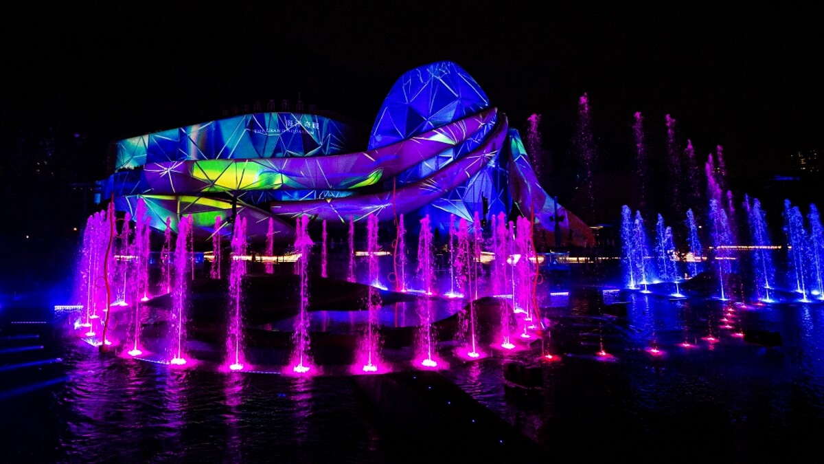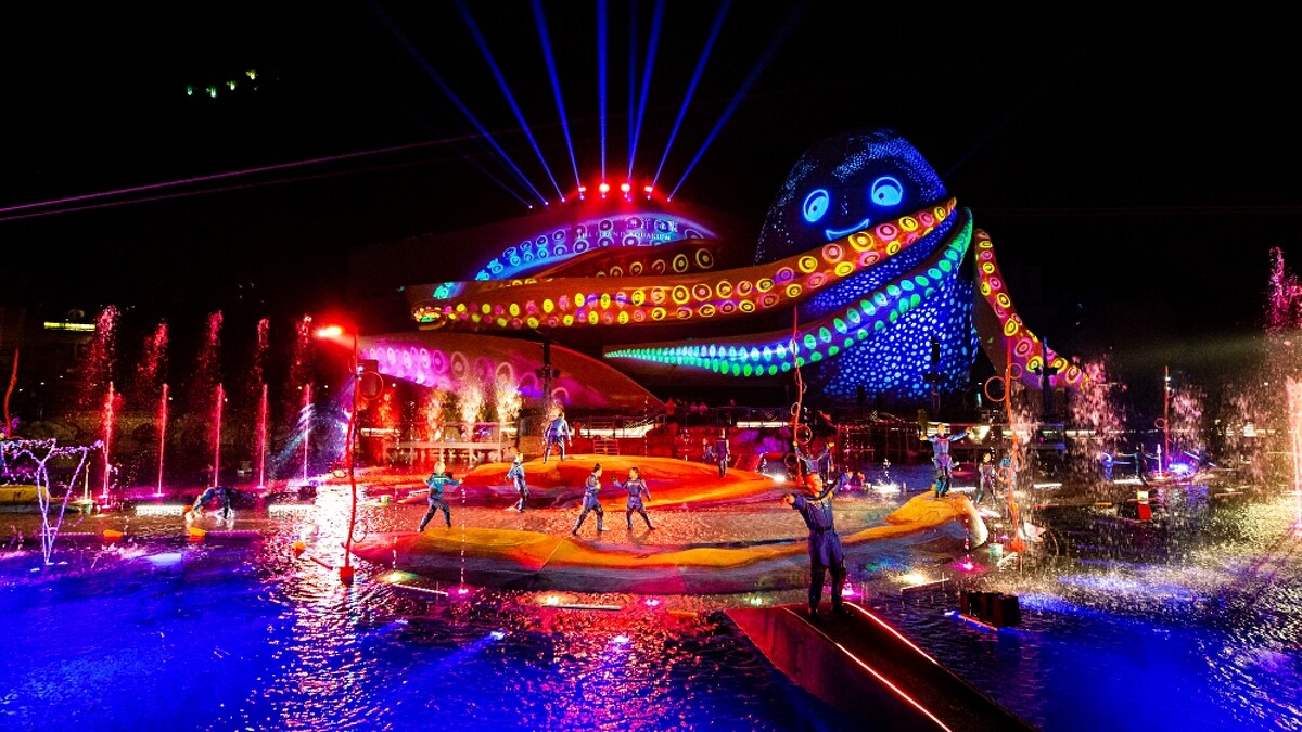 海洋奇觀夢幻水都人工湖,加入300組燈光裝置、立體投影機許多創新技術與裝置,升級為全新舞台。白天是噴泉湖景,入夜後就變身360度全方位表演場地。