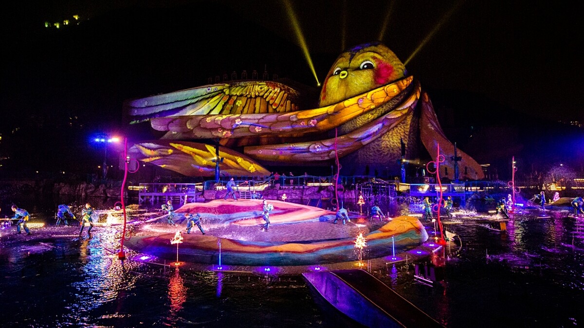 將從12分鐘的「光影頌」揭開序幕,人工湖會變成多媒體展演區。夜間書醒的精靈ANIMO與神祕守護者將展開一段友誼探索旅程,它會變身成繽紛雀鳥、魚、爬行動物或火焰等不同型態,也具有令大小朋友都融化的可愛表情及動作。