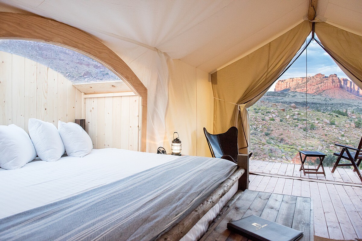 以南非 Safari 為靈感,創辦人Sarah和Jacob Dusek 提供了一個逃離日常生活的可能。2009年創立 Under Canvas 至今,以豪華設施和好品味的設計感,讓旅人在自然裡享受奢華。低調的白色帳棚與木頭地板、印第安圖騰地毯和石材桌面完美融合,彷彿入住五星飯店的豪華雙人床、絲綢床單、柴火暖爐、更不用說一應俱全的盥洗設備。
