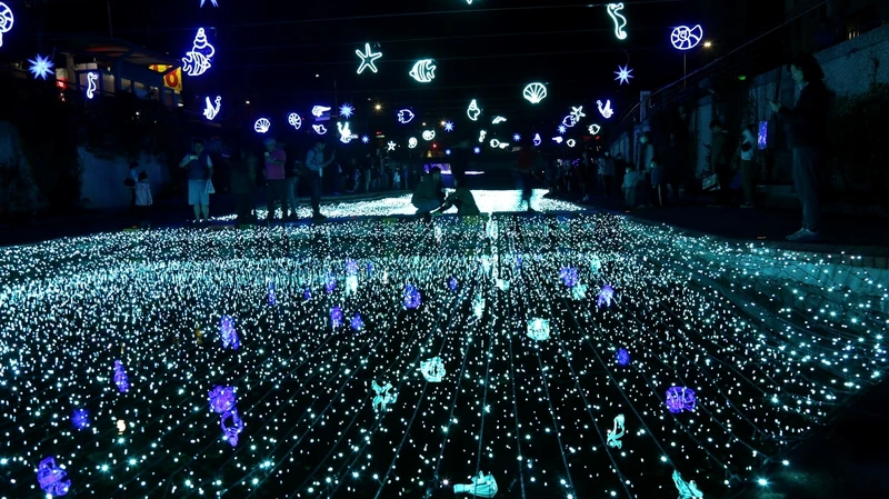 利用大功率投光燈投射,營造出浪漫奪目、2.3公里長的夢幻河廊,上面還優游著海膽、海馬、海豚及魚類等多種海洋生物。池中央更有直徑4米主視覺圓球,白天是地標藝術品,晚上則會利用點控動畫技術,變身成散發魔幻燈光的地球。