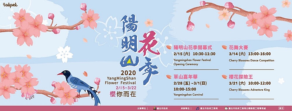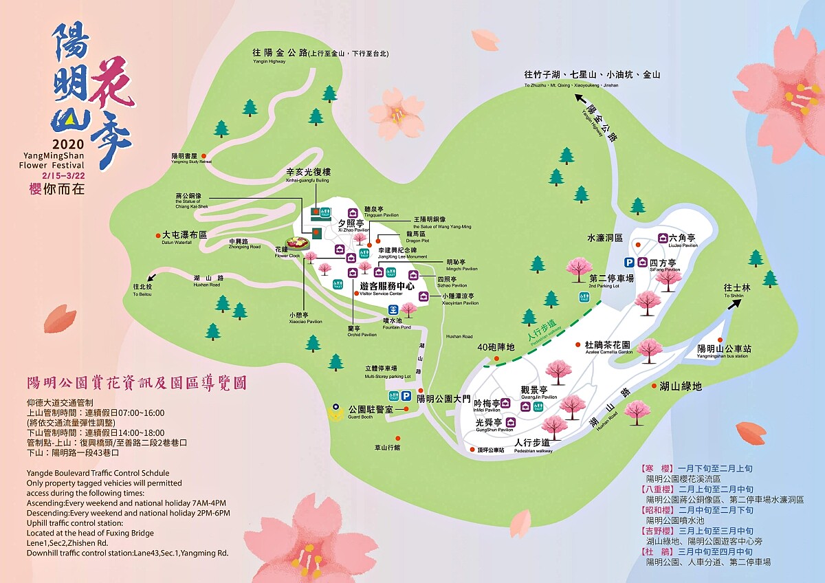 陽明山上種植約600棵櫻花樹,花種包括寒櫻、八重櫻、昭和櫻、吉野櫻,另也有茶花、杜鵑等花朵一同綻放。「2020陽明山花季」年以「櫻你而在」為主題、從2/15~3/22登場,目前已經大開的是八重櫻,已經開了超過7成,正是賞櫻的最佳時機。