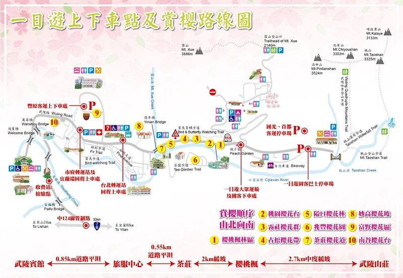 一年四季皆有不同美景的武陵農場,在2月進入最夢幻的櫻花季,官方臉書專頁公告十大賞櫻路線與順序,從櫻桃風林區開始,接連造訪桃園櫻花台、霧社櫻花群、古松櫻花帶、隘口櫻花林、兆豐櫻花園、茶莊櫻花道、妙高櫻花坡、富野櫻花區及南谷櫻花台,一口把春天限定美景全捕捉。
