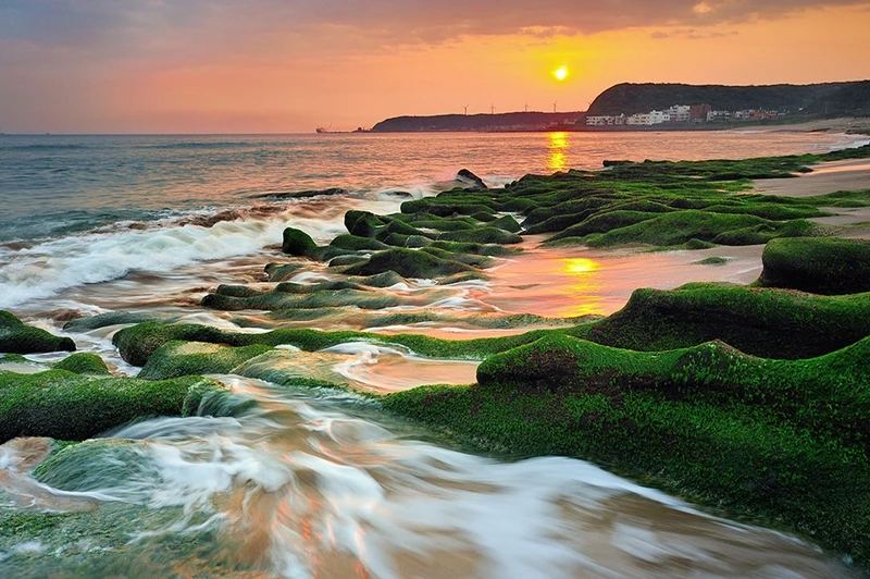 綿延2公里長的老梅石槽,帶有綠意盎然的春天氣象,也受到攝影師青睞,用長時間曝光拍攝方式,便能產生出如仙境般的奇幻效果,成為人氣超夯的拍照景點。只不過要特別注意,因石槽上方相當滑溜,容易摔倒受傷,海藻也會因踩踏被破壞生長。出發前建議查詢石門地區的乾潮時間,以免因漲潮撲空。
