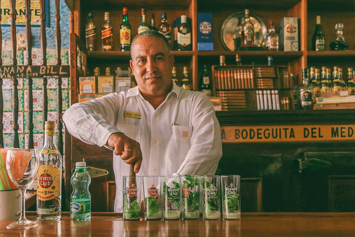 1942年開業的酒館「La Bodeguita del Medio」,因為是文豪海明威的愛店,至今仍天天爆棚,昔日政客和文人雅仕是坐上賓,現在每天聚集歡樂喧鬧的遊客。我幸運地坐在吧台前面的VIP席,欣賞酒保把玻璃杯一字排開,將裡頭的白砂糖、檸檬汁和薄荷葉搗出香氣,再加入三年的 Havana Club 和蘇打水攪拌,成就出氣味清新、酒精濃郁的古巴經典,襯著小型樂團的現場演奏,人手一杯Mojito 的古巴時間,是那麼地快意享受。
