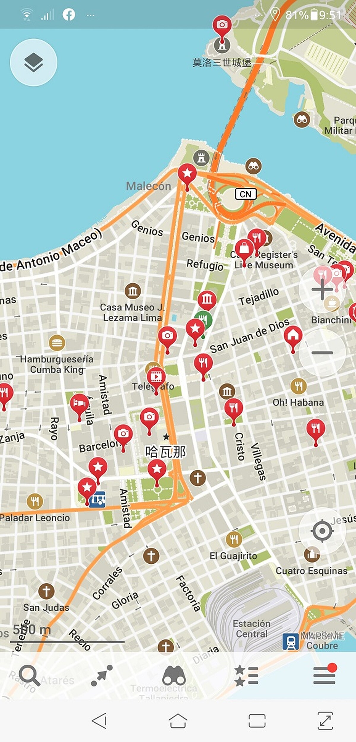 在古巴你無法使用手機漫遊,必需於當地購買網路卡,然後在公園、大飯店的熱點或民宿家中登入計時上網,非常不方便。因此,行前記得手機先下載應用程式「MAPS. ME」,再下載其「古巴」的離線地圖,除了景點店家標記詳盡外,屆時沒有網路也能靠GPS定位移動,不用怕迷路囉!