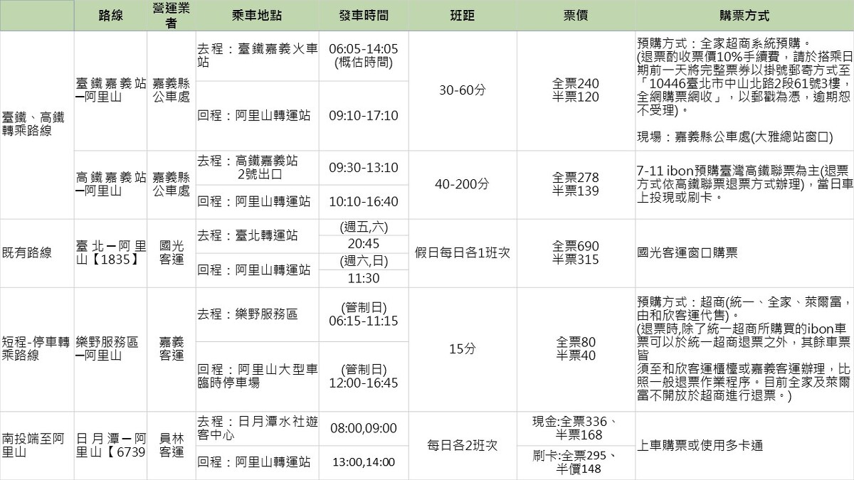 高鐵嘉義站2號出口 → 快捷公車BRT(25分鐘)→ 嘉義火車站→ 搭乘嘉義縣公車處「台灣好行-阿里山B線」(單程全票240元,一天十班)