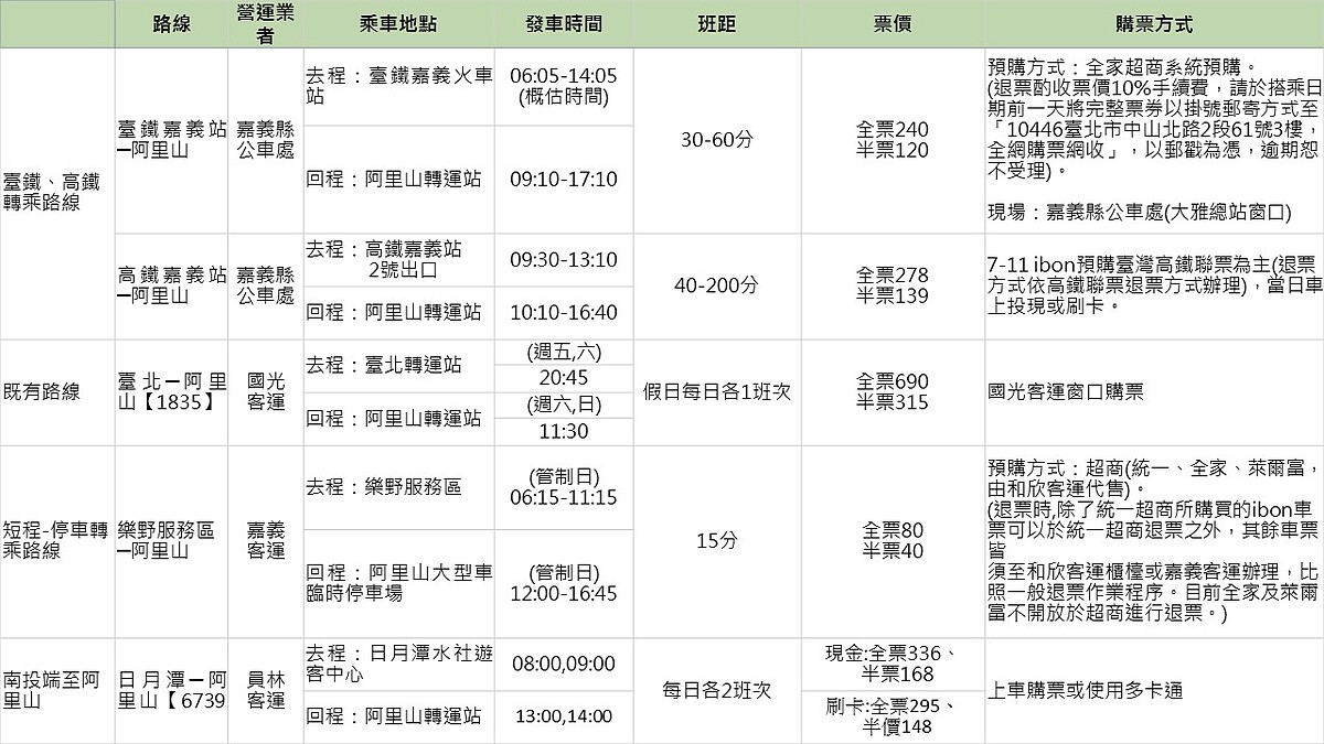 為提升賞花品質,花季期間每日遊客總量管制16000人;3月14~15、21~22、28~29、4月2~5日,共計10天會進行小客車與大客車管制。另外鼓勵民眾使用公共運輸服務上山,公路總局提供5條路線:【高鐵嘉義站─阿里山】、【台鐵嘉義站─阿里山】、【台18線61k─阿里山】、【臺北轉運站─阿里山】、【台21線塔塔加─阿里山】及【日月潭─阿里山】供選擇,班次時刻表及票價請看下表。