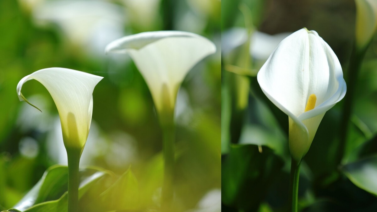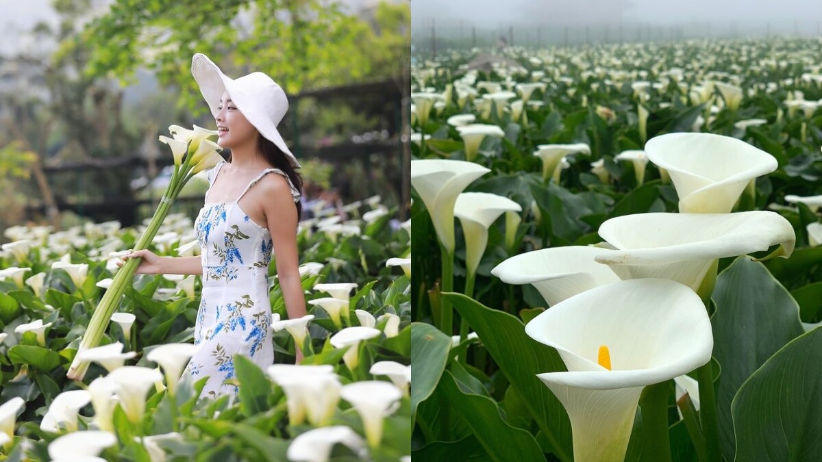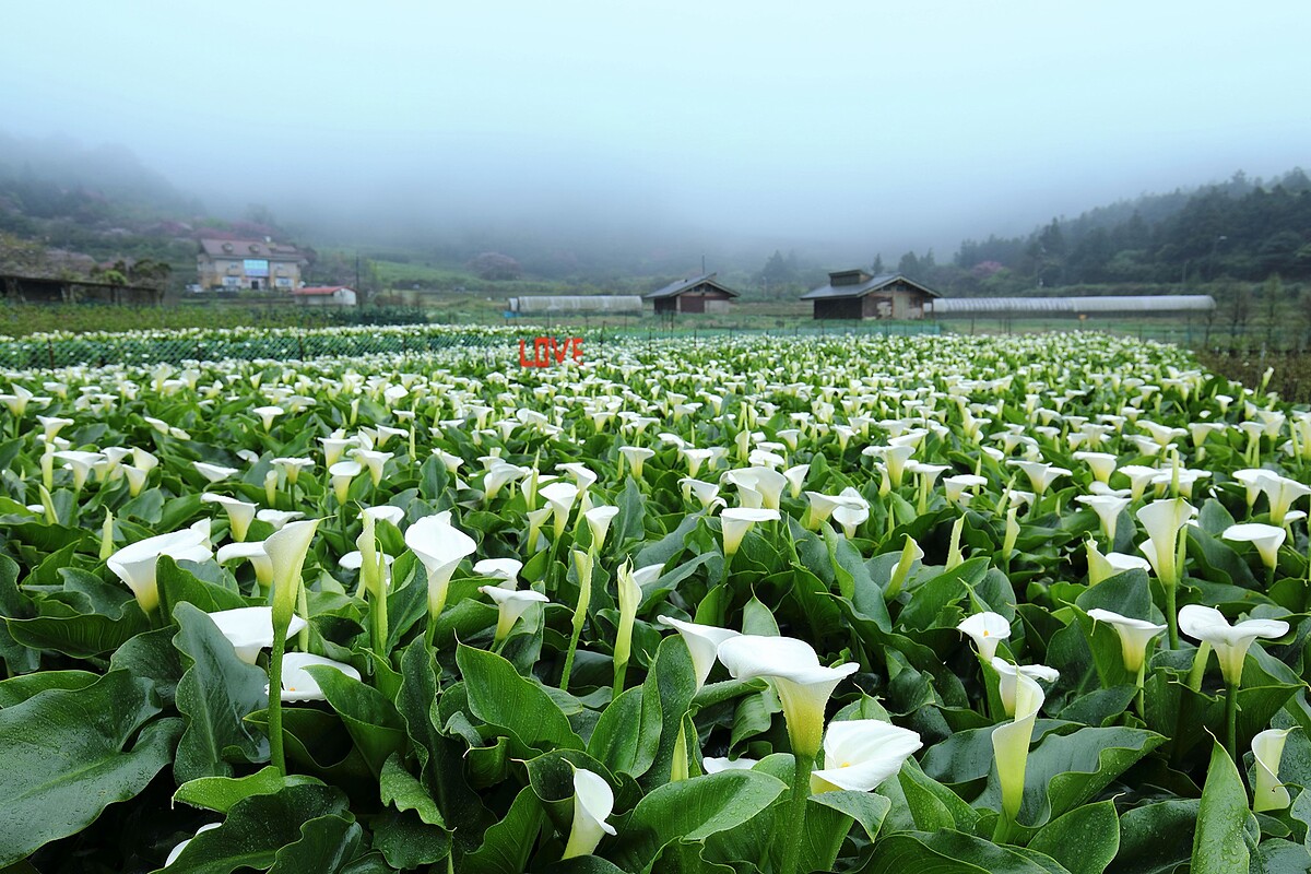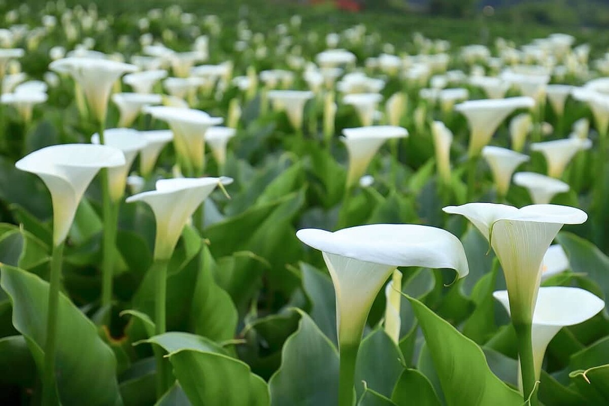 原產於南非的海芋,可分為白、綠色的「濕地型」與紅、黃色的「陸生型」,因花苞盛開時形似到立馬蹄、植株如蓮花般生長水中,因此又被稱作「馬蹄蓮」。有著「雄偉之美」和「潔淨」兩種花語,花期落在1~5月,花量最盛開期為3~4月。陽明山竹子湖海芋總面積達12公頃、產量佔全台80~90%。