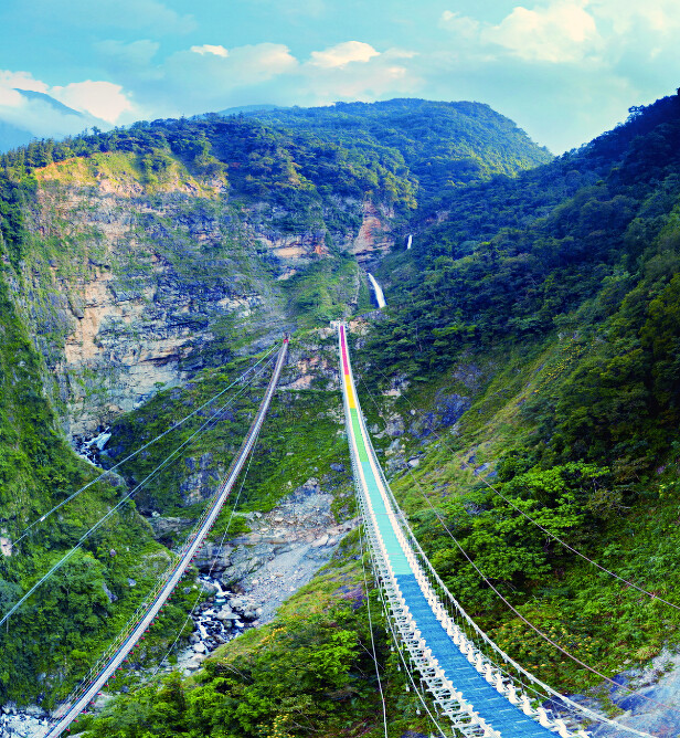 喜歡戶外運動的人,又有全新景點可以挑戰了!搶先在太魯閣新景點「山月吊橋」前,位於南投的「雙龍七彩吊橋」除了是全台最長、最深的吊橋,離河谷深達110公尺,相當於30層樓高,好膽你就來!