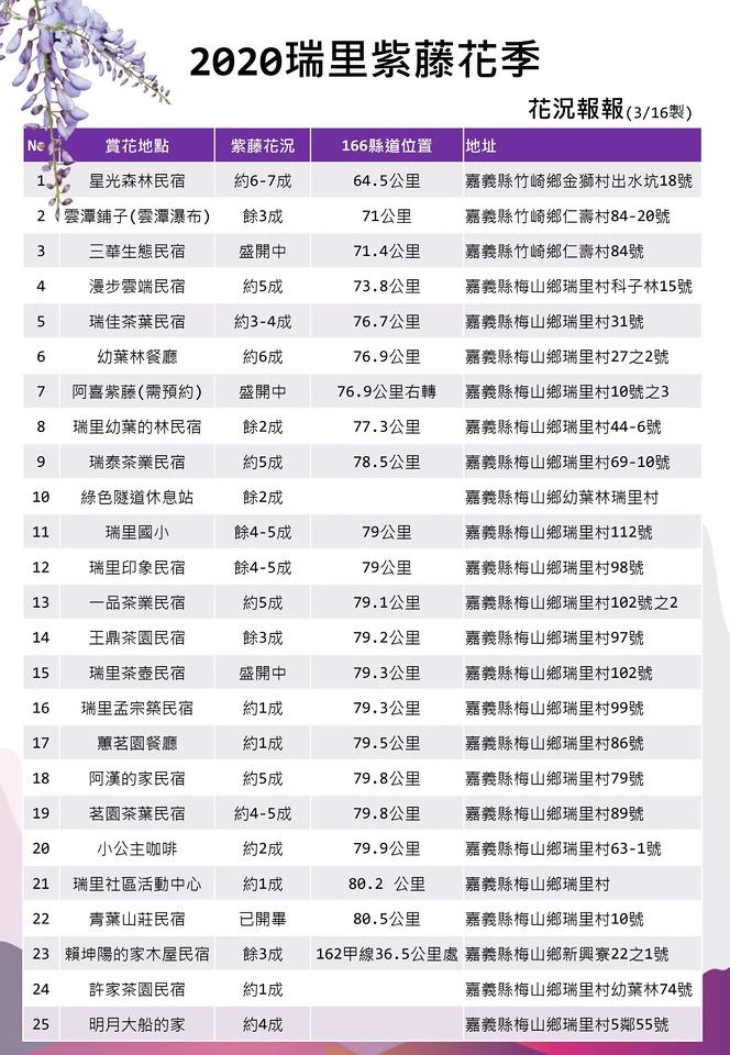 若想一一收集各大紫藤花景點的人,建議開車最適合!由官方於3/16公開的絕佳賞花景點中,其中23個都位於166縣道附近,花況從一成到開畢都有。即日起至4/12都是最佳觀賞期,週末、連假就衝一波,還可以品嚐在地茶餐、高山茶與咖啡,打造一趟春季限定浪漫紫藤花之旅。