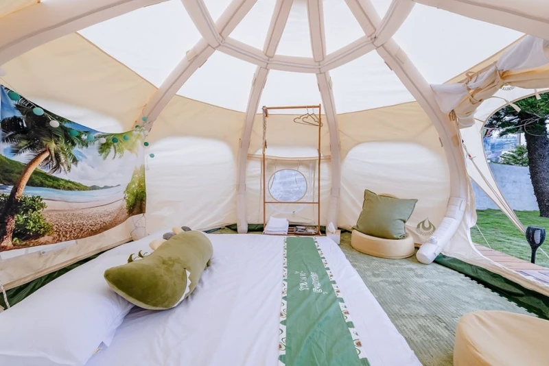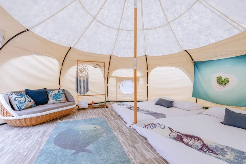 充滿異國風情的可愛造型帳篷,內部空間可是出乎意料的大!舒服的床墊、沙發、懶人椅及衣架,被旅客盛讚是「小型套房」。外頭還有大草皮活動區、含沙坑與溜滑梯的遊戲區、小動物區及餐廳區,可以進行日出、觀星、烤肉、野餐或夜遊等豐富活動。