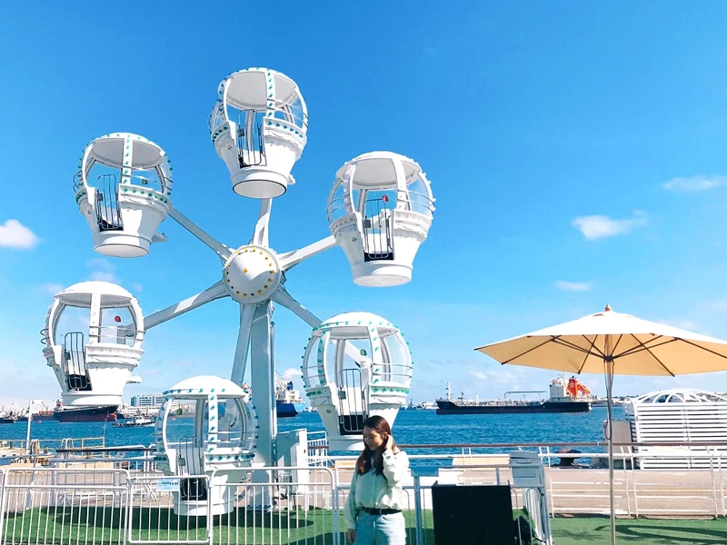 5/1登場的「氣球飛輪」,以熱氣球造型做設計,承襲旋轉木馬的純白色系,光用看得就值得心花怒放!乘坐時宛如跟著熱氣球緩緩升空,也因半開放式觀景車廂設計,能夠從高處俯瞰港濱風光、夕陽餘暉,是拍網美大片、約會的絕佳好去處。