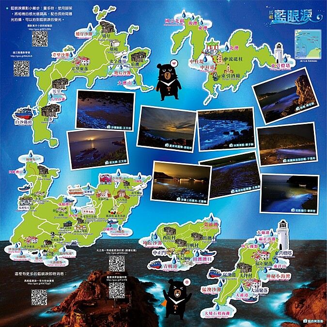 馬祖連江縣政府表示在此季節,「四鄉五島」都有機會看得到,建議前往東莒的福正沙灘、猛澳港;北竿橋仔、芹壁沙灘、塘後道沙灘;南竿鐵堡、福沃港以及東引中柱堤、國之北疆等地尋找藍眼淚的蹤影。或可以預約期間限定的「夜間搖櫓觀賞藍眼淚遊程」一探神秘境地。
