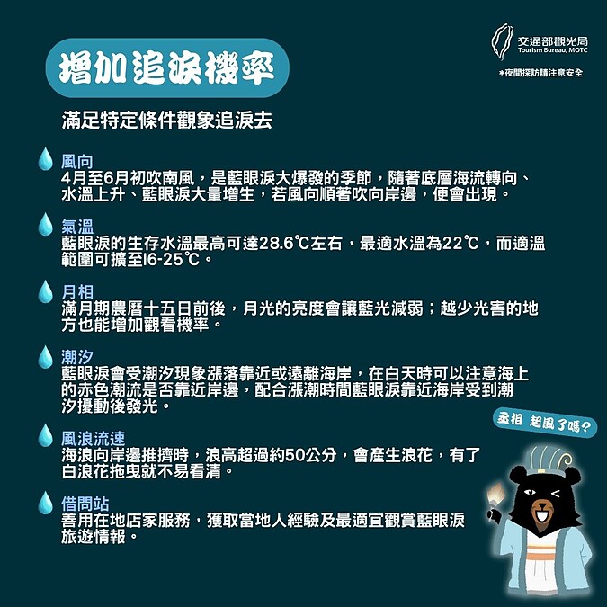只不過要看到絕美夢幻的藍眼淚,是需要技巧與運氣的!首先要在午夜以後(乾潮與滿潮之間),找尋無光害的地方,以及清澈水質、風平浪靜、低流速及不規則地形的環境,因以上元素後都會影響藍眼淚的可見度,而若能滿足農曆十五日前後、適中風 浪流速條件,都能提升看到最美畫面的機率。