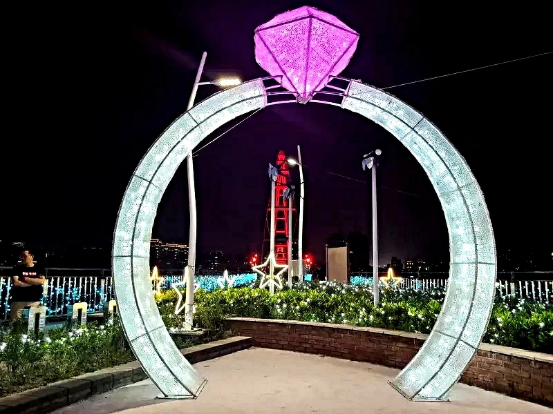另外一個同樣吸睛破表的,是超過一層樓高的「全台最大鑽戒」佈景!鮮豔明亮光芒,在兩旁如同星河般的引道映襯下,更顯浪漫唯美。每半小時會有短暫5分鐘僅有裝置藝術與幸福光雕點燈,想要拍下放閃照的情侶們,可要抓緊時間。
