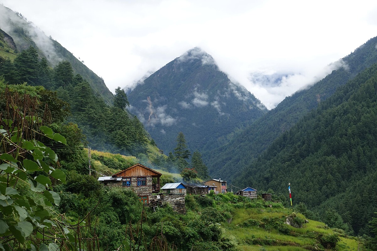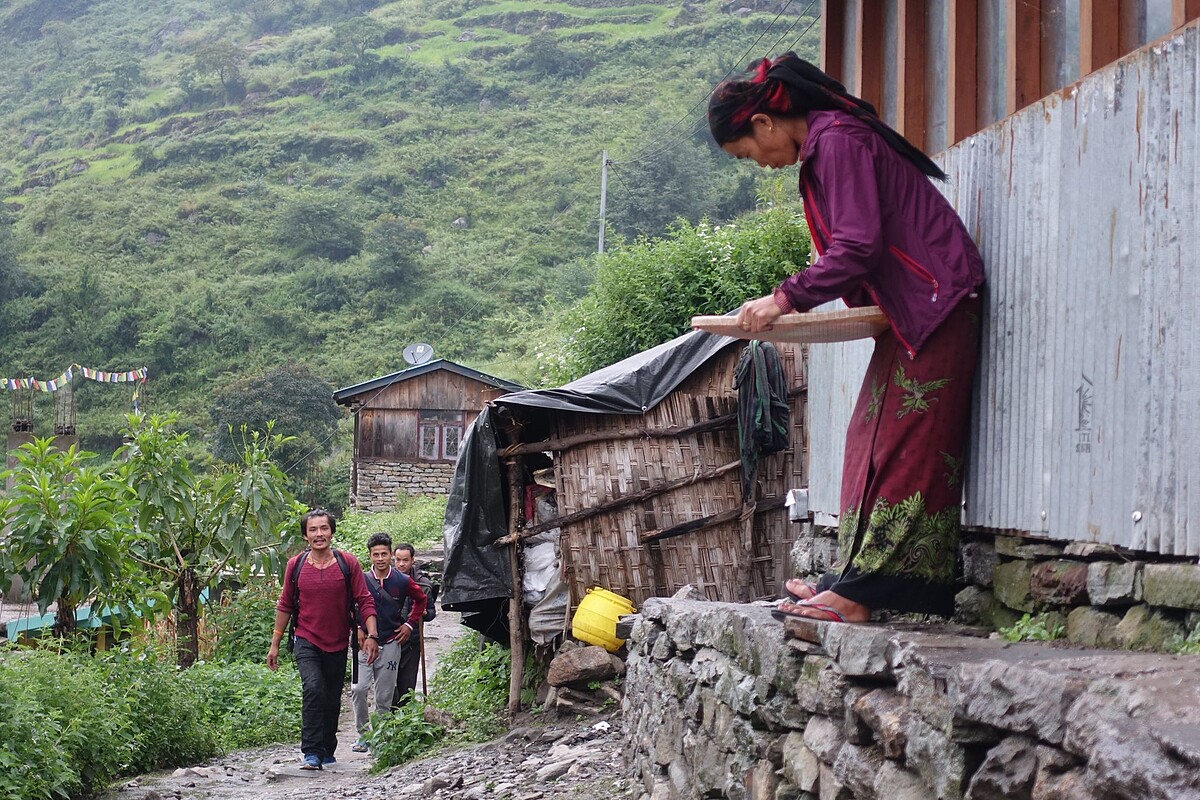 隔日,搭了一天顛簸的吉普車,眼看要抵達起點 Soti Kola,車子突然停住,嚮導下去周旋回來說,大雨沖斷了公路,車子無法再行進,我們只好七手八腳立刻從悠閒轉急迫,被迫提早開始健行模式走到今夜下榻處。我知道大家都說,馬納斯魯 大環線的冒險指數較聖母峰基地營或 安娜普納環線更高,只是這五公里碎石路來得意外,完全是老天爺給我們的下馬威。事後我們淋了一週的雨,回想這最初的時刻,才明白一切早有徵兆。我們一路往東北方,順著菩提河右岸向上逐漸攀升,有時貼著石壁上的鐵棧道前行,下方是滔滔江水;有時在密不透風的林道走著,忍受螞蝗溜進鞋襪,就著我的小腿大快朵頤,但多數時候都在雨裡行走,覺得自己像路上的羊群一樣傻。