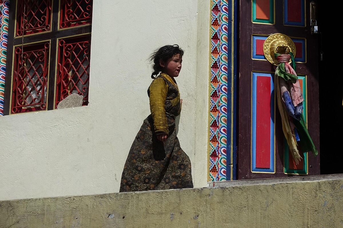 可惜壞天氣居多,我們一路經過 Philim、Chumling、 Chekampar,藏民的生活樣貌越來越純粹悠然,但我們的鬥志卻越來越薄弱。在Chekampar,Karma 旅館的年輕西藏女孩,從上個村落嫁來這裡,二十幾歲已經是三個孩子的媽,最小的還揹在背上號哭,跟媽媽在廚房進出。其他兩個在外頭寒風徹骨的院子裡玩推輪胎,到處搗亂不時被忙織布的外婆痛罵一頓。 太喜歡跟這樣小小的民宿廝混,已經走了五天的我們感到疲倦,要繼續往隱谷折返點 Nile 前進嗎?非要去看傳說中非常厲害的 Mu Gompa 嗎?(Gompa 為喇嘛寺之意)或是花錢招來直升機送我們下山?各種荒誕念頭都有,但柏德利對瑟縮在窗邊的我們好聲相勸:「你們都大老遠來隱谷,給自己打打氣,不要被大雨澆熄熱情好嗎?」堅強的心理素質是登山必要的配件之一,被淋到厭世的我們只好打起精神爬上懸崖上的 Mirarepa 洞穴,看了傳說中聖僧在這隔離修行多年之地,接著又繼續踩著泥濘路往 Nile 前進。