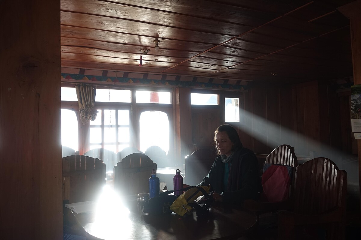 從 Deng 到 Namrung,依舊是雨中上坡,柏德利又跳出 來彩衣娛親:「相信我喔,今天晚上的旅館非常豪華,熱水澡非常舒適!」健行到了第八天,對於基本人權要求已經剩一天疲累過後可以洗個熱水澡,水溫不要忽冷忽熱、水量不要斷斷續續最好。Namrung 的 Thakali 旅館果然非常 奢華,全部木造結構頗有歐洲山屋的氣派,熱水澡更是舒爽到令人升天。看到隔壁桌,另一個團隊的登山客已經和嚮導開始意見相左,我慶幸柏德利算很會看風向的旅伴。在山上,天氣好壞要看運氣,嚮導也是。如何能拿捏距離,適時鼓舞人心,做出最安全的決定,都靠嚮導的經驗與旅人的運氣。來到略微淒冷的Lho,這村落算是在 Larkya 埡口前最後一個熱鬧基地,我們在這吃著品客洋芋片(簡直像A Cut牛排一樣珍貴,事實上入山後便無肉可吃),用著中等速度的無線網路,覺得自己像個君王。從明天開始,Samageon、Samdo、Dharamsala、Larkya La,地勢一路險峻,全都超過四千公尺,比玉山還高了。不但要小心高山症,累積多日的疲累,身體也可能趁隙反撲。