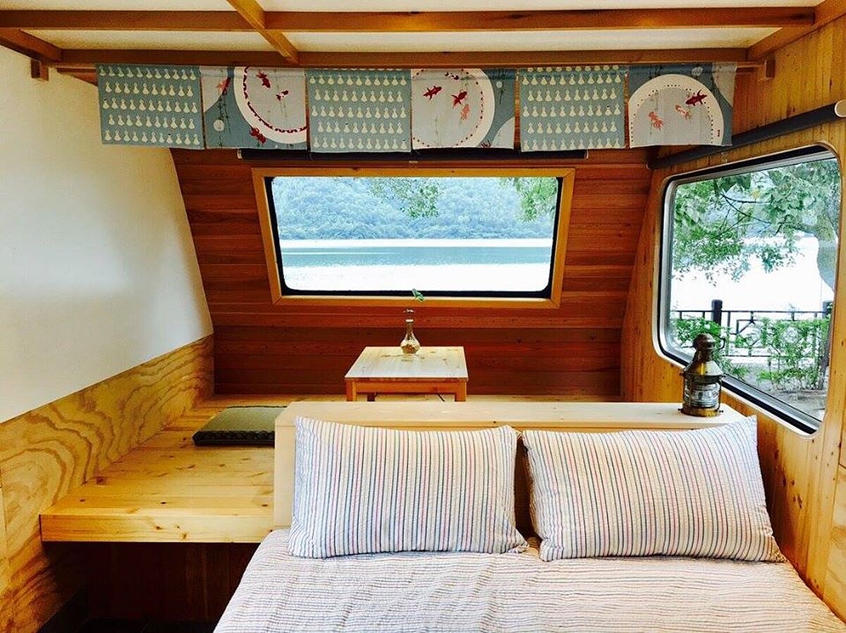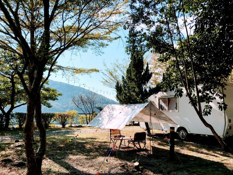 車子可以直接停在露營車旁邊,內裝走和風木質調,很有閒暇風情!冷氣、備品、拖鞋、冰箱通通有。外頭則提供遮陽用餐區、翌日有早餐,可以在潭邊吃早餐,看陽光灑落在露營車內外,再騎腳踏車環湖,讓去過的旅客都想再住一回。