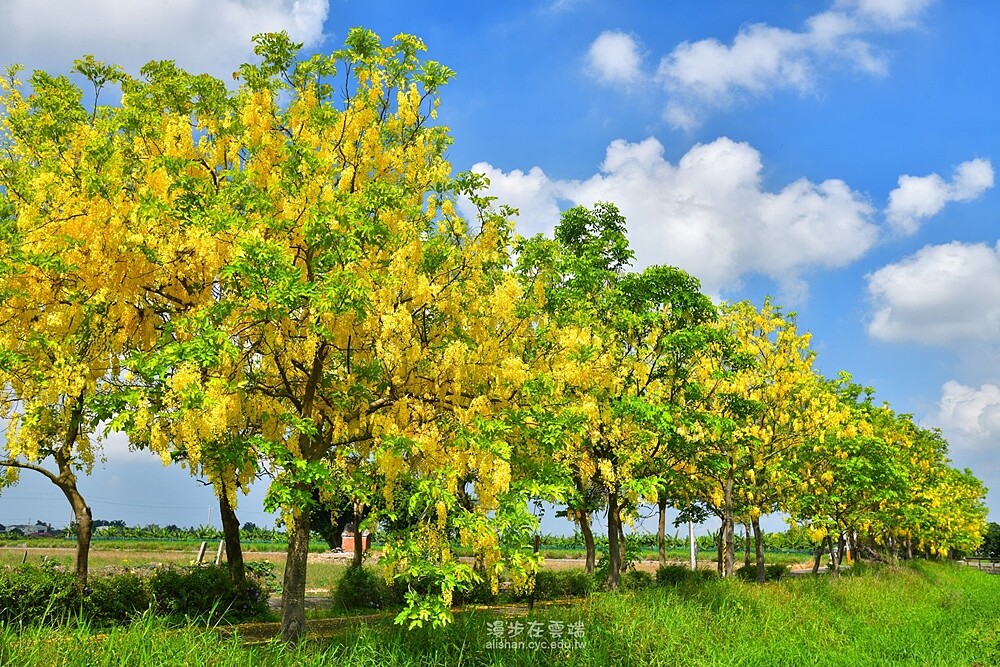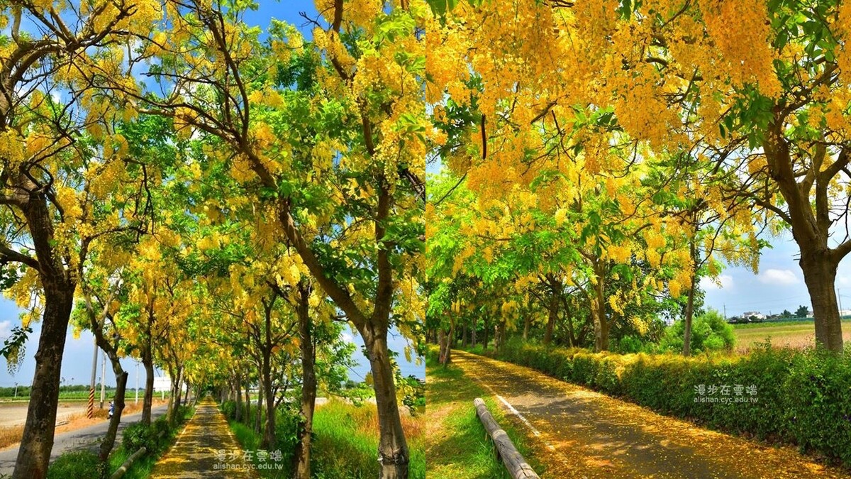 而現在已經浪漫登場的,是位於嘉義的「蒜頭自行車道」,與六腳鄉自行車道、朴子溪自行車道、中溝自行車道都屬於「蒜鰲田園自行車道」的一部分。這條長約450公尺的步道,在5月底準時變換成「黃金隧道」,一串串金黃色的阿勃勒隨風搖曳,與綠葉交織出如電影或韓劇中的夢幻場景,立刻吸引大批民眾、網美駐足拍照。