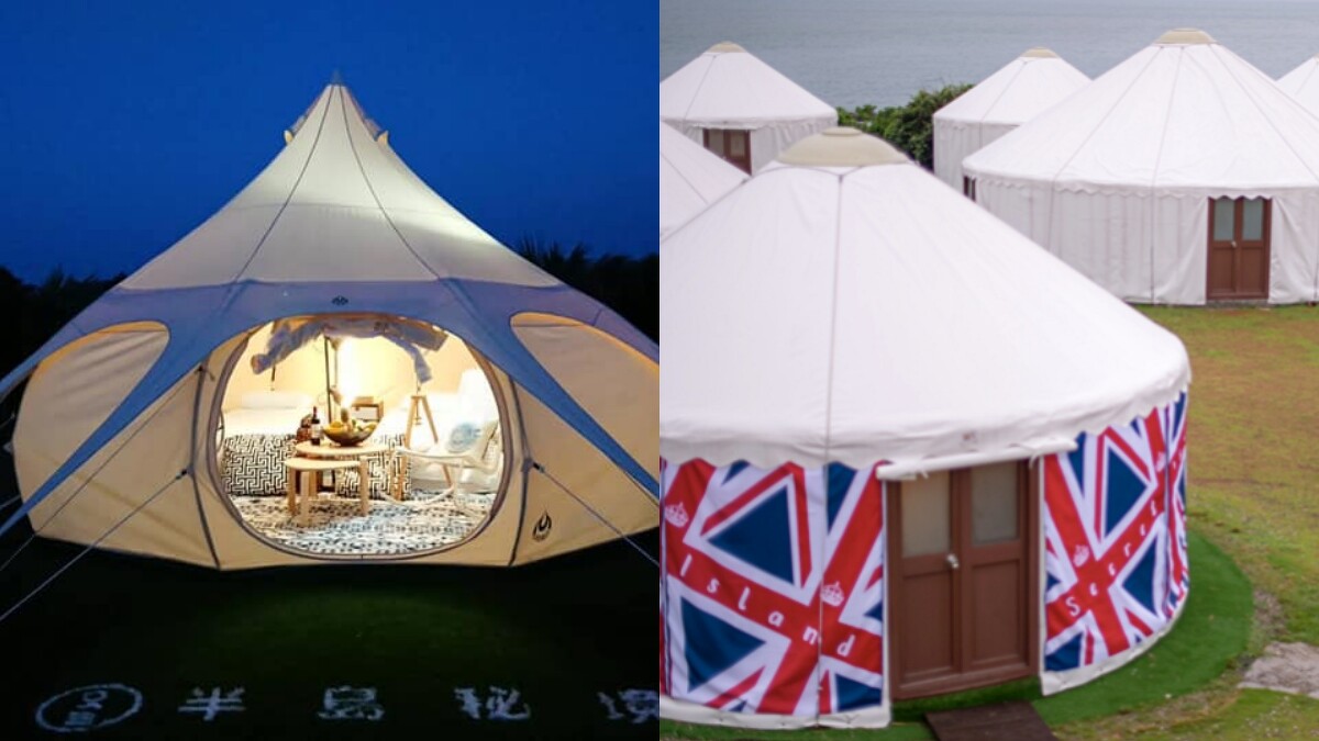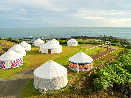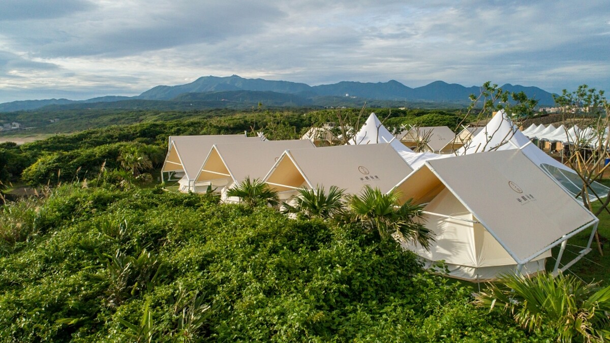 占地10公頃,有進口野奢蓮花帳,也有選用比利時品牌Canvascamp打造的經典鐘型的「神殿帳」,內含兩個25公分彈簧床墊、移動式冷暖空調、電扇與夜燈。另外直徑5米的「蒙古包」,則擁有寬敞挑高結構、開窗設計,帳內也設有冷暖空調,讓人待在裡頭也能眺望大海。