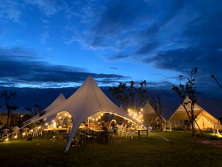 近期則引進全新適合戶外活動、團體聚會使用的星型天幕帳篷,高達三米、抗曬防雨防風設計,是適合員工旅遊、包團的好選擇。另外還有需自帶露營設備的傳統營區及車頂帳營區,可另買烤肉組合體驗露天BBQ。