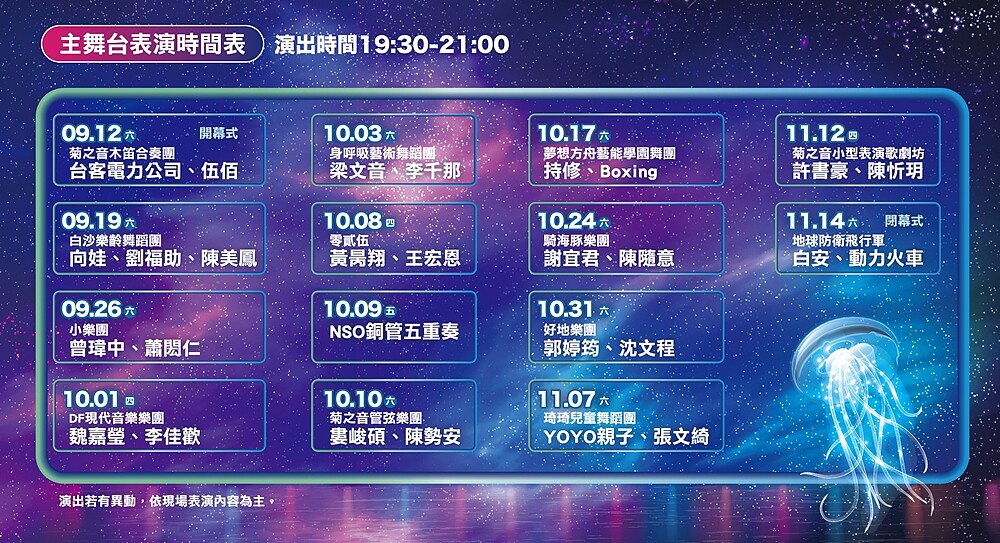 同樣備受期待的,還有主舞台的演出卡司!9/12(六)開幕當天會有伍佰&China Blue進行今年首場大型公開戶外演出;其他嘉賓有陳美鳳、陳勢安、李千那、白安、梁文音等人氣歌手輪番上陣;閉幕則會邀請到動力火車演唱《做工的人》片尾曲〈永遠不再〉,為兩個月海島盛事劃下完美句點。