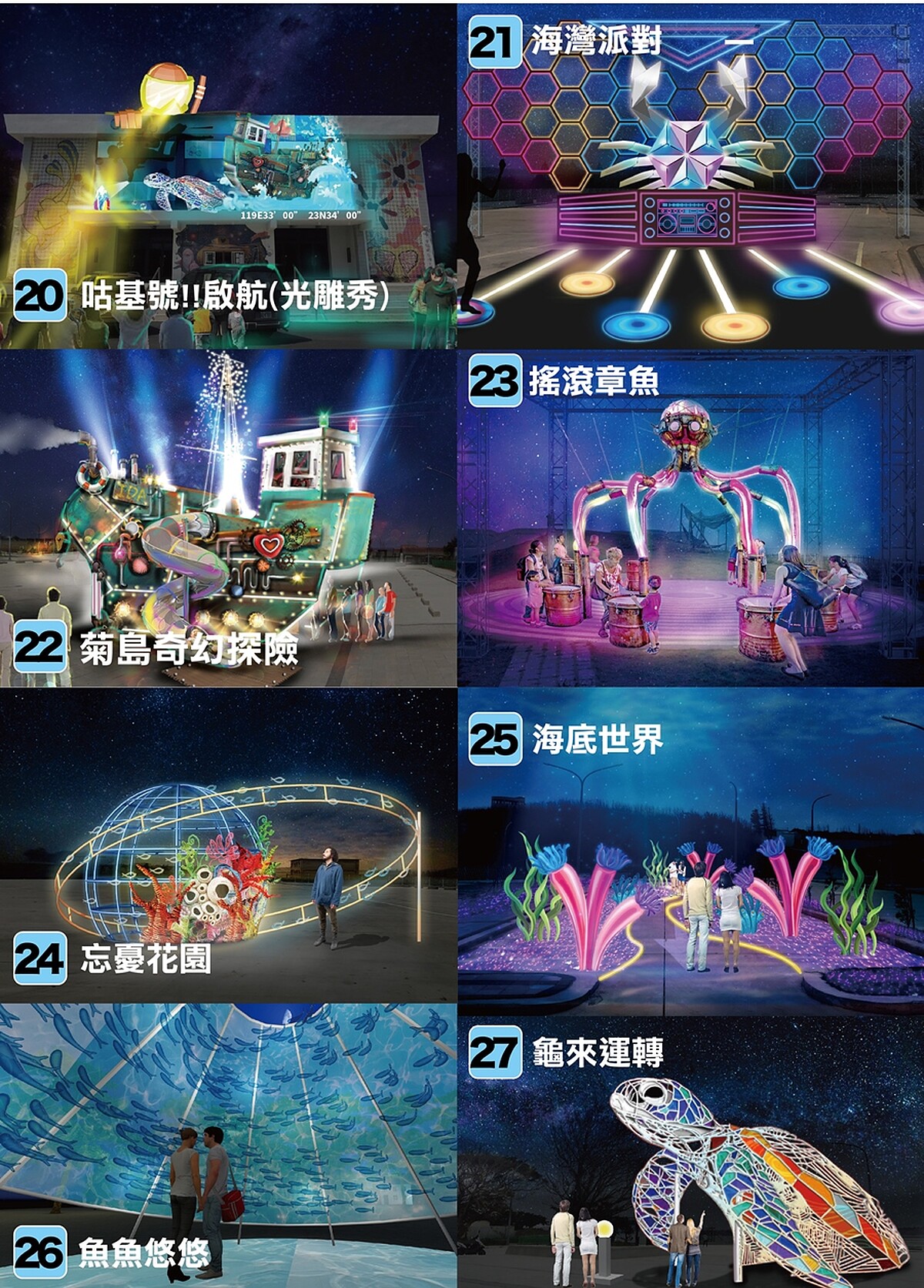 藝術燈區則加入現代科技,像是有蒸氣龐克風格的「菊島奇幻探險」、澳州的Amigo&Amigo藝術團隊設計的「搖滾章魚」、大型燈罩裝置「魚魚悠悠」、祈福燈飾「龜來運轉」等作品,帶領遊客有如徜徉海洋世界中,更另有中正堂光雕秀「咕基號!啟航」,將五光十色光雕秀中加入高潮迭起故事,享受具有臨場感的視覺、聽覺雙重饗宴。