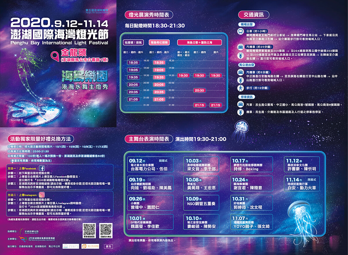 從9/12開幕的「2020澎湖國際海灣燈光節」已吸引超過6萬人朝聖,以「海島人文」為題的主燈區,更獲得IAA國際獎項協會聯盟旗下MUSE Creative Award謬思創意設計大獎頒發「藝術展場活動Art Event」金獎殊榮,成為國內旅遊首選地點!而每日18:30~21:30會進行點燈,舞台活動也從19:30~21:00進行。只剩倒數一個月時間,快把握時間去親眼見證。