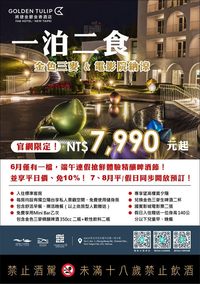 位於「滬尾藝文休閒園區」內的將捷金鬱金香酒店,純白色外型、每間房都能飽覽迷人淡水河,頂樓更能全方位視野景觀,令人流連忘返。迎接暑假推出一泊二食住房專案,更於端午連假6/24~6/28就能搶先入住。