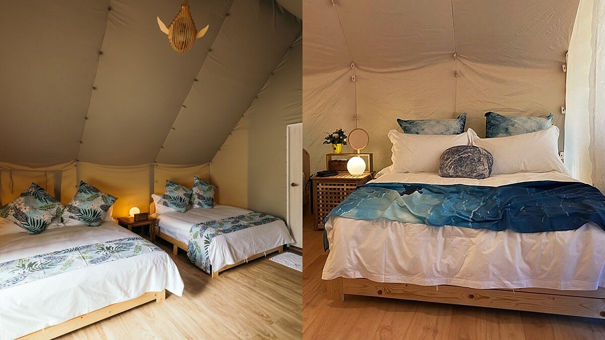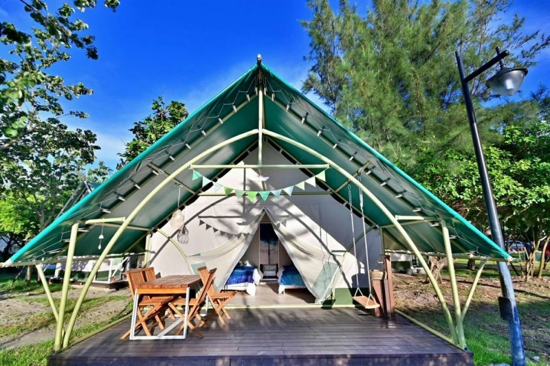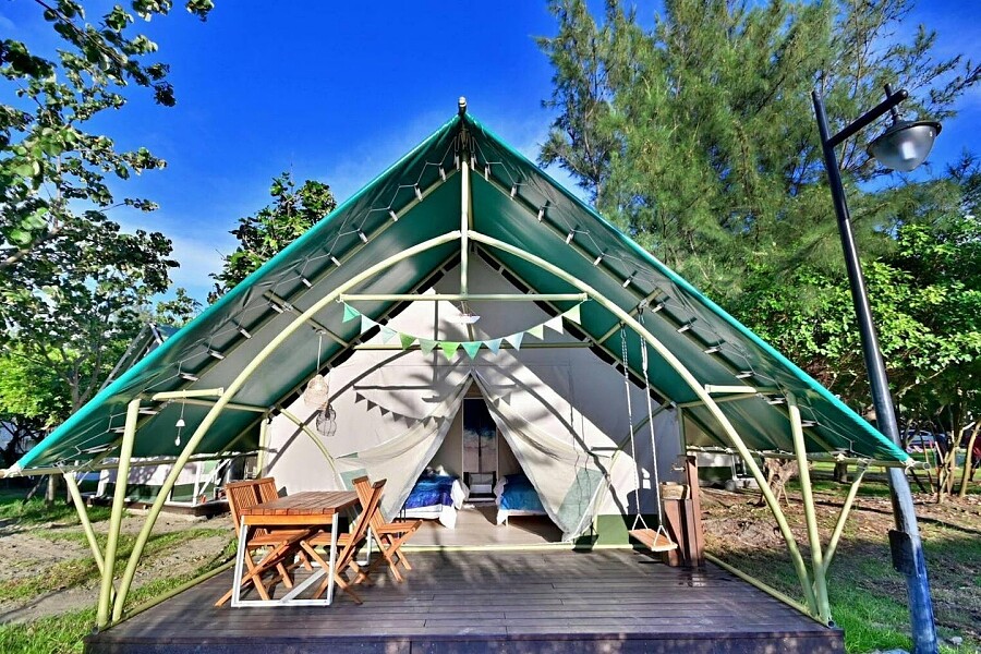 帳篷選用進口頂級帳篷帆布製作,具有防火、降噪、抗紫外線特性。寬敞的內部空間備有沙發、電風扇、冷氣機、床墊與獨立衛浴,帶上簡單行囊就能入住。外頭有步道、觀景台、戶外戲水池與滾球草皮,閨密或一家大小都能恣意散心、放電。