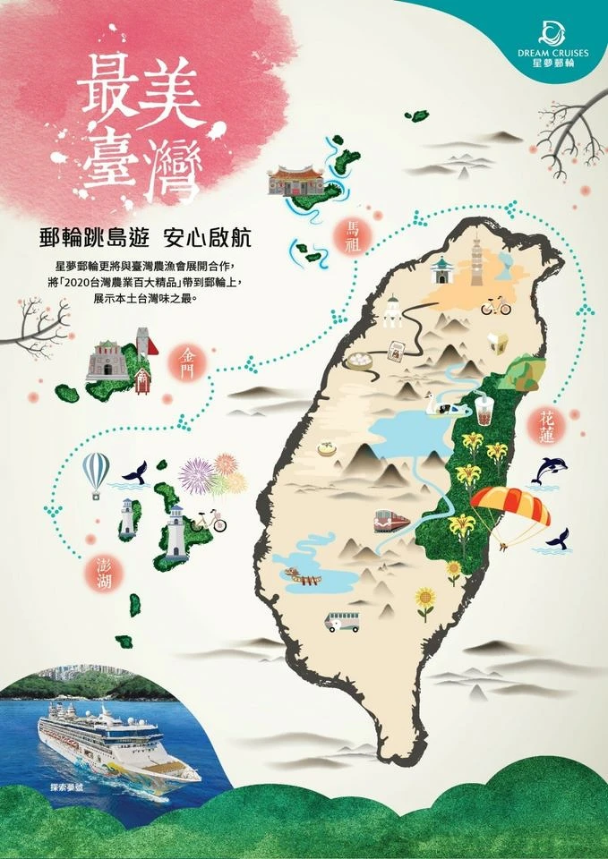 隨著疫情趨緩,「探索夢號」於7/26展開全新的「郵輪跳島遊」航線,以「探索台灣之美,品味台灣之最」為主題,由基隆出發,旅客可選擇4天3夜或3天2夜的航程,將行徑澎湖、馬祖及金門等離島與花蓮景點。雲頂遊輪集團特別找來多年領隊導遊經驗的旅遊專家登船擔任「星夢大使」,用最熟悉的國語提供服務,郵輪上的各項設施體驗都能玩好玩滿。