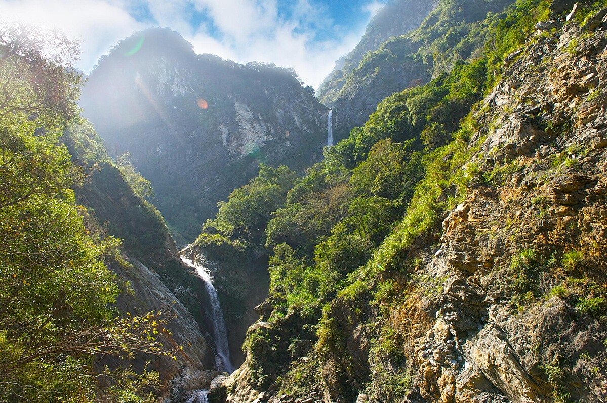步出第五個隧道,山光水色迎面而來,白楊瀑布垂掛對山,猶如它的美麗名字「達歐拉斯」,是為太魯閣人「斷」之意,可見高低落差即大的雙層瀑布,如涓絲般的揮灑在山脈之間。