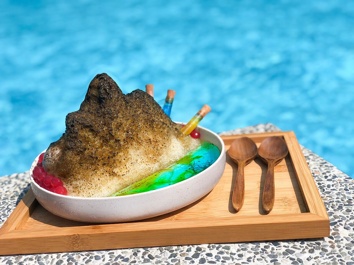 以焙茶剉冰勾勒出壯闊的峽谷山景,搭配手工洛神花粉圓,挖開還可品嘗紫心薯冰淇淋及焙茶奶凍,豐富口感層次;以石花凍、海藻製成一旁碧綠的湖畔,可依自己喜歡的口味選擇淋上煉乳、抹茶酒或藍橙甜酒增添風味,濃郁的焙茶香氣中帶一絲清爽酸甜。