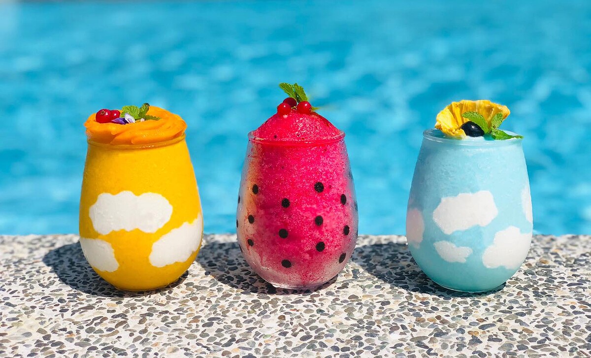 「黃金芒果雲朵冰沙」以夏季盛產的芒果搭配酸甜優格製成,再以鮮奶油妝點雲朵造型;「藍天白雲酒釀雲朵冰沙」使用小米酒酒釀與藍橙調酒製成;「盛夏西瓜冰沙」選用在地種植的西瓜,果肉清甜多汁,可愛的西瓜造型讓人還沒開始品嚐,暑氣就消了一半!