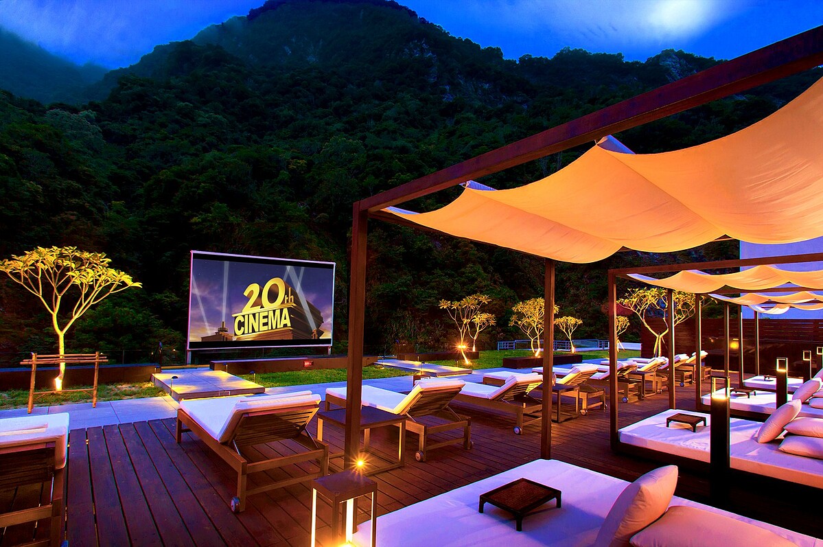 而太魯閣晶英酒店除了無邊際眺望山崖泳池外,還有露天電影院,大家可以選擇躺在躺椅、懶骨頭……等等,在戶外一邊瞭望星空、一邊欣賞電影,也是很舒壓的選擇!