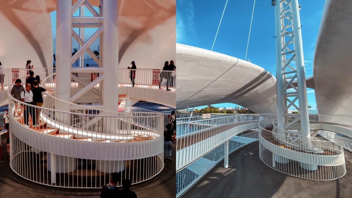 而中央有著流線型設計的觀景平台,也有共36階的螺旋式階梯環繞著主塔,不妨一步步攀上、眺望壯闊的高雄港美景。也適合在遠端欣賞「高雄港大港橋」夕陽、夜景與水面倒影,為港都之旅留下美好又難忘的畫面。