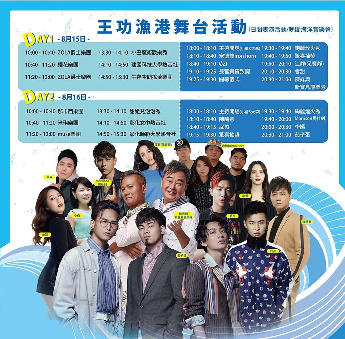 活動重頭戲就在晚上6點登場的「海洋音樂會」,連續兩天會有陳昇&新寶島康樂隊、茄子蛋、OZI、屁孩等多位歌手輪番上陣。等到晚上7點半就有最大亮點「絢麗煙火秀」施放,屆時將點亮彰化夜空與西海岸,為盛夏留下燦爛畫面。