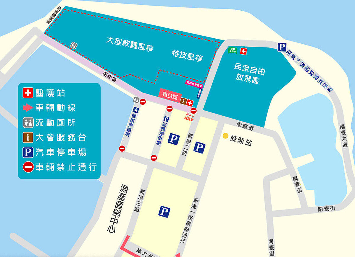 國道一號,下竹北交流道 (往竹北方向)→光明六路→中華路→台68線(往南寮)→直行南寮大道→活動會場