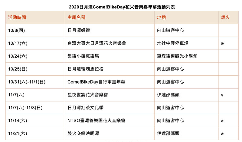 近年來活動加入自行車、馬拉松、紅茶產業文化、婚紗旅遊等多元不同主題面向,今年更適逢日月潭國家風景區管理處成立20週年,使得「2020日月潭Come!BikeDay花火音樂嘉年華」相當精彩可期。一共有9大主題活動,交通部觀光局貼心整理出列表,將日期與地點一目瞭然。