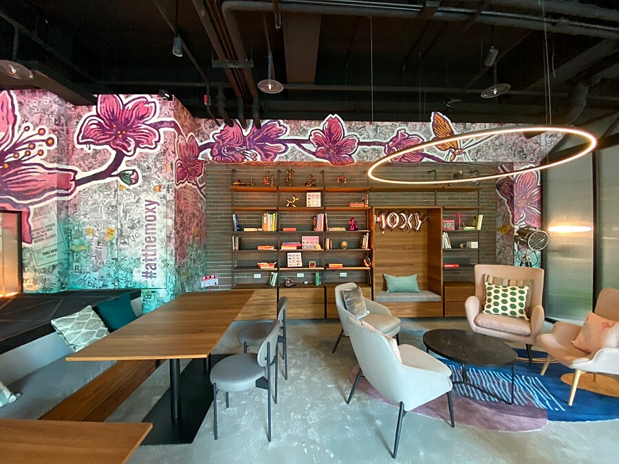 而在符合Moxy品牌規範的Quiet Zone一樓夾層閱讀空間中,也以台中市花「山櫻花」作為藝術塗鴉主題,為這間酒店再添一處必打卡熱點。