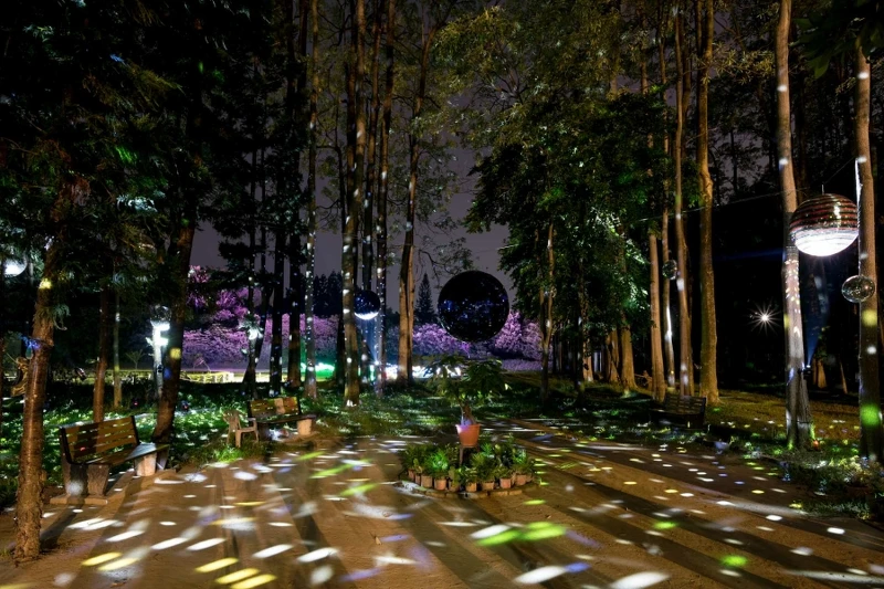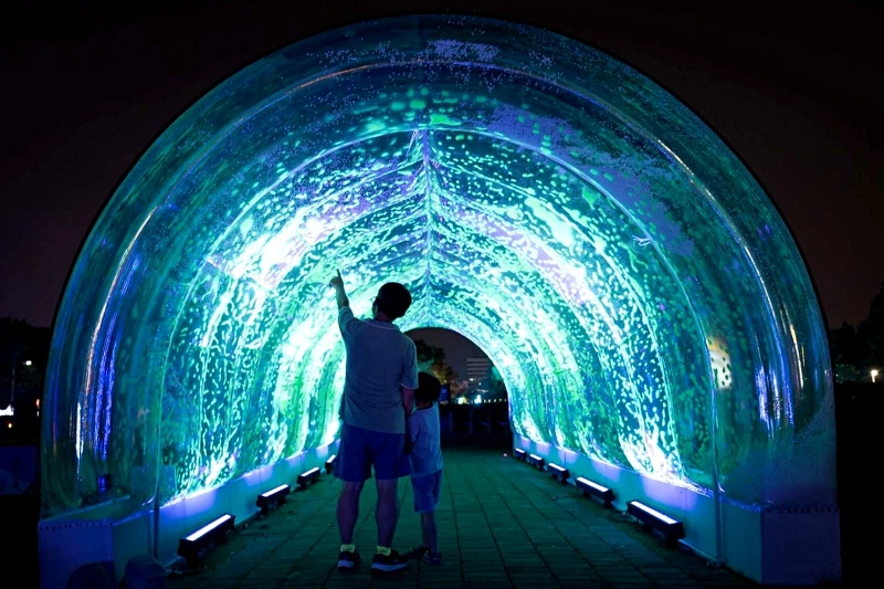 「浩藍星夏」則在100米樹林步道上,投射藍雷光線,並加入檜木香氣雲霧,讓人宛如徜徉在夏日神秘星空下。象徵秋天的「鏡花雪月」有全台最大的月亮,還將嫦娥、月兔圖案投影在上。而「漫天飛雪」則透過風動裝置,讓半透明隧道飄動著雪花,搭配著夜光雪景噴繪,營造漫步雪地中的奇幻感受。