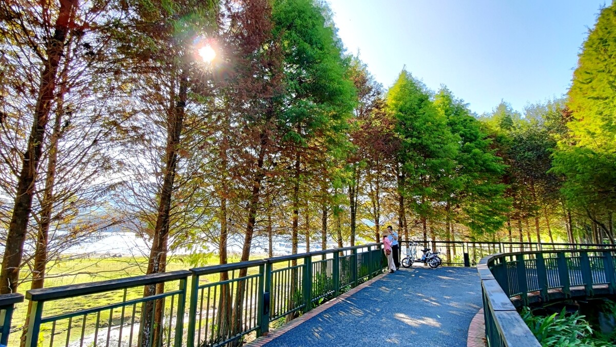 到了南投,不得不朝聖有「全球十大最美自行車道」美名的日月潭自行車道!全長6.4公里,能夠一邊感受微涼秋意、穿梭在湖邊的落羽松林之間,成為絕佳約會行程。不只有落羽松迷人,陽光從樹葉間灑落的光影,也相當浪漫唯美。