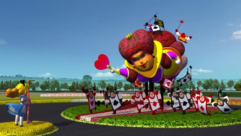 主花毯「勇氣之心」就是最大亮點!10公尺高的紅心皇后飛向愛麗絲,下方還有一堆撲克牌士兵護送,主花毯秀時間還會搭配水霧、動態裝置,成為必看亮點。故事中的經典角色如智蟲、瘋狂茶會中的帽匠、看著懷錶趕路的兔子,也都會一一在展區中現身。