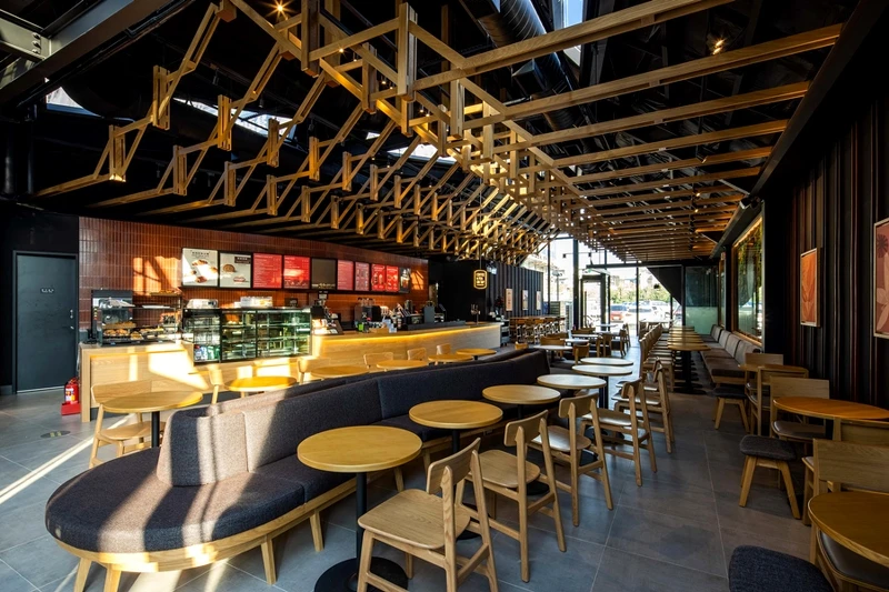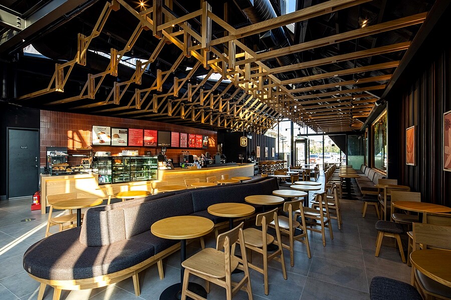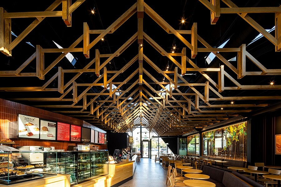 承襲每個城市都會打造特色門市,星巴克北港門市呼應北港朝天宮擁有上百年歷史,在門市建築設計上以「雙手合十」意象貫穿整體,加上室內到外觀的格柵天花、能聯想到寺廟古樸紅棕色的色調點綴室內,傳遞出虔誠、莊重與結合在地風情的的氛圍。